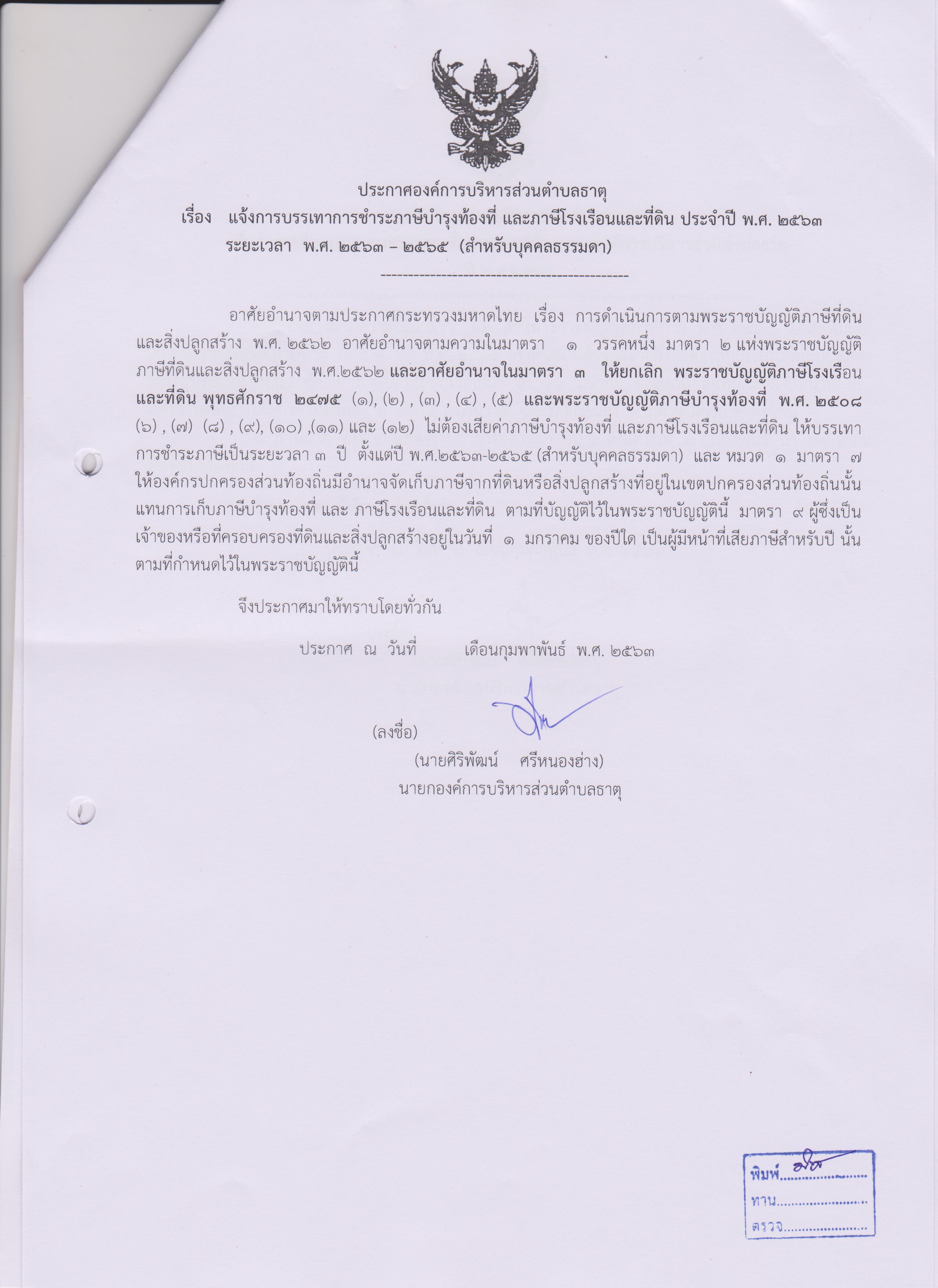 ประกาศแจ้งการบรรเทาการชำระภาษีบำรุงท้องที่ ภาษีโรงเรือนและที่ดิน ประจำปี พ.ศ.2563 ระยะเวลา พ.ศ.2563-2565 (สำหรับบุคคลธรรมดา)