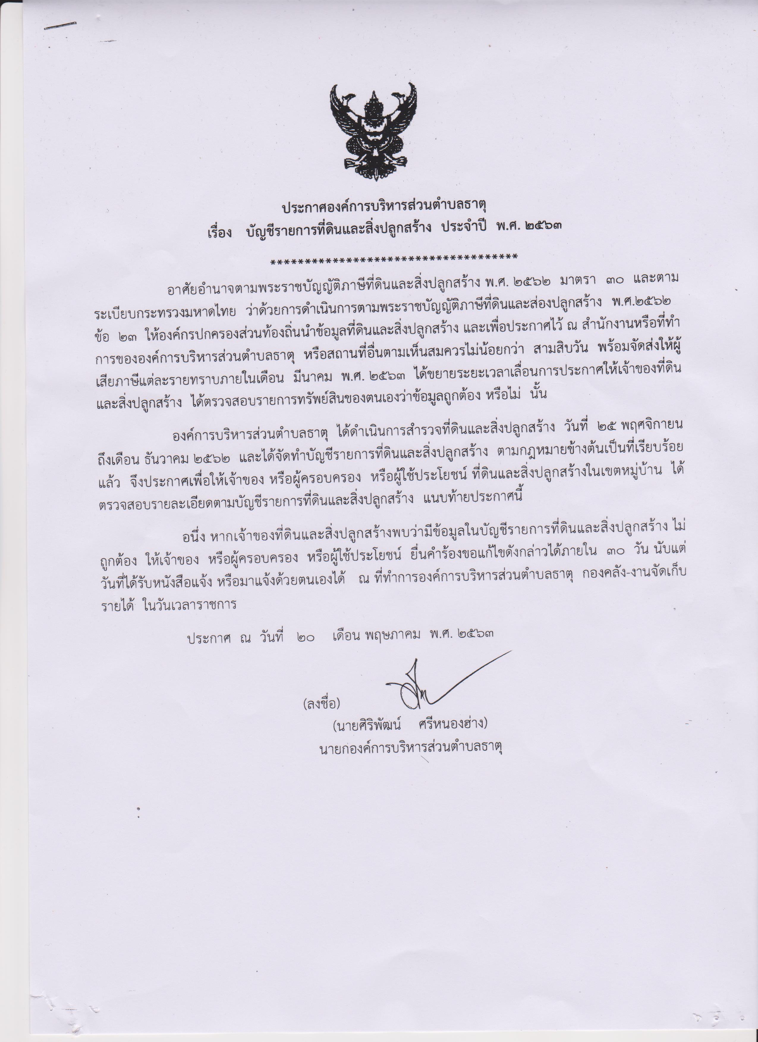 ประกาศบัญชีรายการที่ดินและสิ่งปลูกสร้าง ประจำปี 2563 ครั้งที่ 2